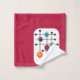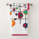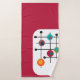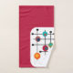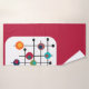 This towel set has a mid-century modern design of a magenta rectangle with a white rectangle at the bottom with a black grid with retro circles on it.