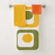 This towel set has an orange washcloth, a yellow hand towel, and a bath towel with a mid-century modern design of four rounded rectangles in four rows with ovals inside them in orange, yellow, green, and turquoise.