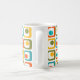 This mug has a mid-century modern design of four rounded rectangles in four rows with ovals inside them in orange, yellow, green, and turquoise.