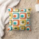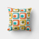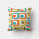 This throw pillow has a mid-century modern design of four rounded rectangles in four rows with ovals inside them in orange, yellow, green, and turquoise.