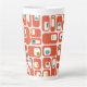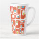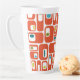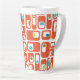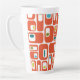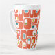 This tall mug has a mid-century modern design of orange rectangles with white rectangles and green and blue ovals inside.