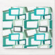 This mouse pad has a mid-century modern design of skewed rectangles with white holes in shades of blue-green.