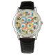 This men's watch has a mid-century modern design of four rounded rectangles in four rows with ovals inside them in orange, yellow, green, and turquoise.