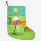 This Mid Century Modern Retro Housewife Christmas Stocking will have you breaking out your strands of pearls to do the most mundane tasks. The design features a lime green background with a green, classic tube television set (complete with rabbit ears), and an orange footstool. But, the pièce de résistance is most assuredly the classic television housewife wearing a poofy pink dress with a turquoise and white apron and turquoise shoes. Her blonde hair is perfectly flippy and her hand is holding a vacuum nozzle. Of course it is! What else would she be doing if not making her home sweet home a little bit sweeter?