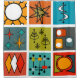 This shower curtain has a mid-century modern design of a smorgasbord of mid-century modern graphics in retro colours.