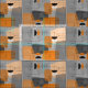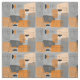 Mid-century modern space age abstract fabric in colours of grey, peach and orange on a grey background.
