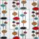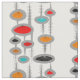 Funky space age ovals fabric with triangles. Colours of bright orange, red, teal and black on a white background. Mid-century inspired fabric design. All graphics by Gail Gabel, LLC.