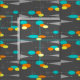 Mid-Century Modern spheres and triangles on a dark grey background with spheres in colours of bright blue, orange and yellow.