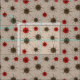 A mid-century modern starburst pattern. Colours are red and brown on a light brown background.