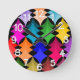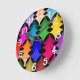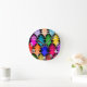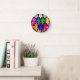 This wall clock has a mid-century modern design of retro stars in shades of red, orange, yellow, green, blue, and purple.