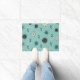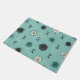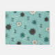 This atomic era inspired art pattern has sputnik starbursts styled lines and planet-like circles in off-white cream, brown and teal, with a turquoise background.