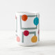 This mug has a Mid-century modern design of grey trapezoids with colourful circles on them.