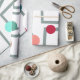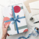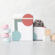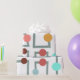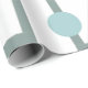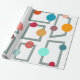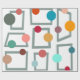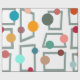 This wrapping paper has a Mid-century modern design of gray trapezoids with colorful circles on them.