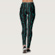 These leggings have a mid-century modern design of lines with half-rectangles in turquoise on a field of black.