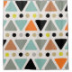 A 1950's style art pattern with triangles and dots in many colours such as orange, gold, yellow, sky blue, slate grey and black.