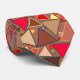 Tie in a Mid-Century Modern geometric mosaic of outlined triangles in light taupe, camel, chocolate brown, and coral red on a deep taupe tan background