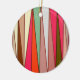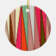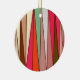 Ornament in a retro modern geometric pattern of elongated triangles, in shades of taupe tan and brown, with fuchsia pink, orange and seafoam green accents