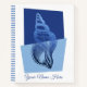 Personalised journal in a mid-century modern, minimalist, boho style print of a turban seashell in an ocean blue gradient against geometric forms of dark and light blue