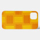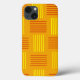 This phone case has a mid-century modern design that looks like a weave with red and yellow lines on a field of gold.