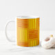 This mug has a mid-century modern design that looks like a weave with red and yellow lines on a field of gold.