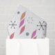 An atomic era retro design with a Christmas theme. Features silver snowflakes and red, orange and purple Christmas tree ornaments.