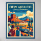 5 star quality travel poster of New Mexico (Land of Enchantment) featuring family and landscape such as cactus, mesa, desert, and mountains in mid-century design.