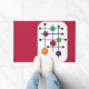 This doormat has a mid-century modern design of a magenta rectangle with a white rectangle at the bottom with a black grid with retro circles on it.