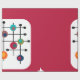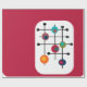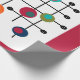 This wrapping paper has a mid-century modern design of a magenta rectangle with a white rectangle at the bottom with a black grid with retro circles on it.