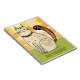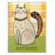 Cute notebook featuring an adorable illustration of a kitty cat in styles of mid century, retro, abstract art. The background to the illustration is a yellow check pattern. Use the customise text tab to add your name or other text which is below the image of the cat.