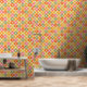 This is elegant mid century modern starbursts on geometric colourful circles pattern in red, orange, olive green , yellow and pink . It's great looking wallpaper for anyone who retro geometric designs
