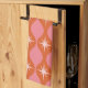Add retro flair to your kitchen with these mid century modern kitchen towel featuring white atomic starbursts on orange ogee pattern over pink background.