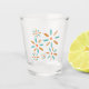 This funky mid-century themed shot glass features abstract flowers in turquoise blue and two shades of orange and would be perfect for a mcm bar cart.
