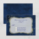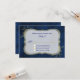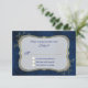 Sophisticated chic wedding RSVP card done in a dark blue background, with a tinkling effect. Decorative gold leaf sprigs surround the opulent gold framed text area. Custom blue text is ready to personalise for your special day. Matching products available.
