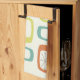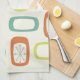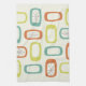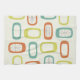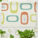 A simple minimalist 1950s abstract art pattern with rounded rectangles and sputnik starbursts in chartreuse, turquoise and orange.