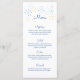Create a beautiful and elegant personalised wedding menu. This menu card features a fun retro vibe with a Mid-century Modern style design. Colourful atomic asterisk or snowflake shapes decorate the top. The asterisk shapes are in shades of blue and yellow with your information in royal blue lettering. Use the template fields to easily personalise this with your information.