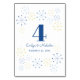 Create a beautiful and elegant personalised wedding table number card. This card features a fun retro vibe with a Mid-century Modern style design. Colourful atomic asterisk or snowflake shapes decorate the top and bottom. The asterisk shapes are in shades of blue and yellow and your text is in royal blue. Use the template fields to easily personalise this with your information.