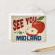 A charming Midland Texas vintage travel postcard featuring a lovely red apple, along with fun retro style text that says, "See you in Midland"