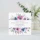 Elegant floral wedding invitations displaying your wedding details framed by a top and bottom border of purple, mauve & blue watercolor flowers with lush green leaves. The back features a solid dark blue background. Designed to coordinate with our Midnight Blooms wedding collection.