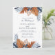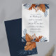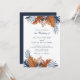 The front of the invitation features a captivating display of midnight blue monstera leaves, tropical foliage, and rustic brown dried palm leaves. The combination of these elements adds a touch of tropical flair to your special day. The personalised text is elegantly presented in midnight blue script and minimalistic font, lending a sense of sophistication and style to the design.