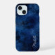 An iPhone 15 case featuring a moody dark blue watercolor design. Personalise it by adding your full name to the case.