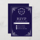 Elegant RSVP card featuring an elegant white ornate border and beautiful monogram against a dark blue background.