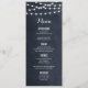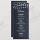 Chic modern summer wedding menu card design with simple elegant glowing string lights hanging across the top and a classy mix of modern and calligraphy script fonts on a printed faux watercolor texture background. A simple and stylish preppy design, perfect for summer! Click the CUSTOMIZE IT button to customise fonts, move text around and create your own unique one-of-a-kind invitation design.