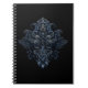 This notebook showcases an intricate, symmetrical filigree crest in deep midnight blues set against a dramatic black background. Flowing ornamental lines and layered botanical forms create a sense of depth, balance, and quiet sophistication. Designed to feel both modern and timeless, this notebook is ideal for journaling, sketching, or thoughtful note-taking—perfect for creatives, writers, and anyone drawn to refined, ornamental design with a contemporary edge.