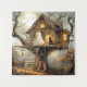 Perched atop a gnarled old tree, a rustic treehouse glows with warm lantern light, casting flickers across the autumn leaves below. A ghostly figure lounges peacefully on the porch beside a watchful black cat, both bathed in moonlight as bats swirl overhead. Bare branches stretch into the night sky, silhouetted against the full moon’s silver gaze. Whimsical and eerie, the scene hums with quiet magic—where spectral visitors and feline companions share secrets under the stars.