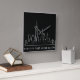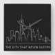 A minimalist skyline of New York City in sleek white lines with bold text: “THE CITY THAT NEVER SLEEPS”.