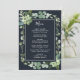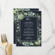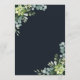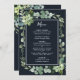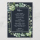 This wedding menu features painted watercolor succulent, eucalyptus, and botanical green leaves with a rectangle frame on a midnight navy blue background. Matching items are also available.