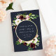 An elegant wedding save the date design featuring your wedding details centred in a gold foil-framed circle, with a border of lush watercolor flowers and foliage in blush, ivory, burgundy, and green on a rich midnight blue background.