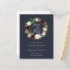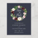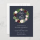 Elegant watercolor floral save the date postcards feature "save the date" in chic calligraphy inside a wreath of watercolor flowers in burgundy marsala and blush pink with lush green leaves and foliage. White lettering on a rich navy blue background adds dramatic elegance to this beautiful floral save the date postcard.