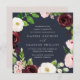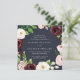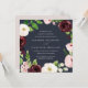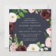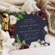 Our square shaped Blush Romance wedding invitation surrounds your wedding day details with a wreath of watercolor blossoms in ivory, burgundy marsala and blush pink, accented with lush green botanical leaves and foliage against a rich midnight blue background.