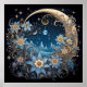 This intricate digital painting, "Midnight Serenity," captures a breathtaking nocturnal landscape. A crescent moon and a star-studded sky are framed by ornate, swirling floral designs in shades of blue and gold. The scene evokes a sense of magical calm and beauty, perfect for a poster that adds an ethereal touch to any room.